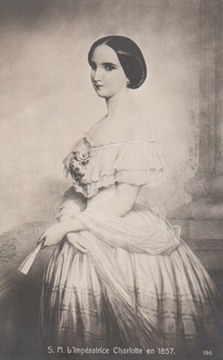 Keywords: Empress Carlota, Wettin family, Habsburg family, Empress, straight coiffure, off shoulder vee neckline, bertha, modesty piece, floral bodice ornament, wrap, vee waistline, full skirt, fan