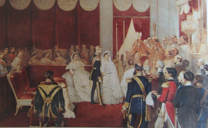Princess Charlotte of Belgium's bridesmaid wears a dome-shaped crinoline with vee neckline and a vee neckline in this painting of their Brussels wedding.