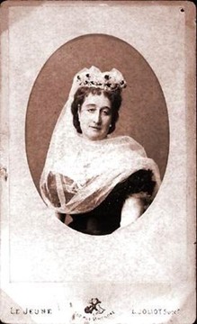 Photographer Le Jeune portrays a pensive Empress Eugenie wearing a veil and dark dress in this 1869 photograph.
