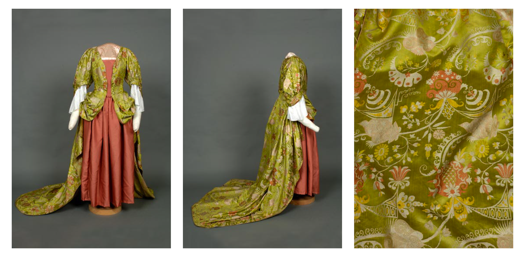 The under-dress and engageantes may be modern replacements, but the mantua draped over them is original.