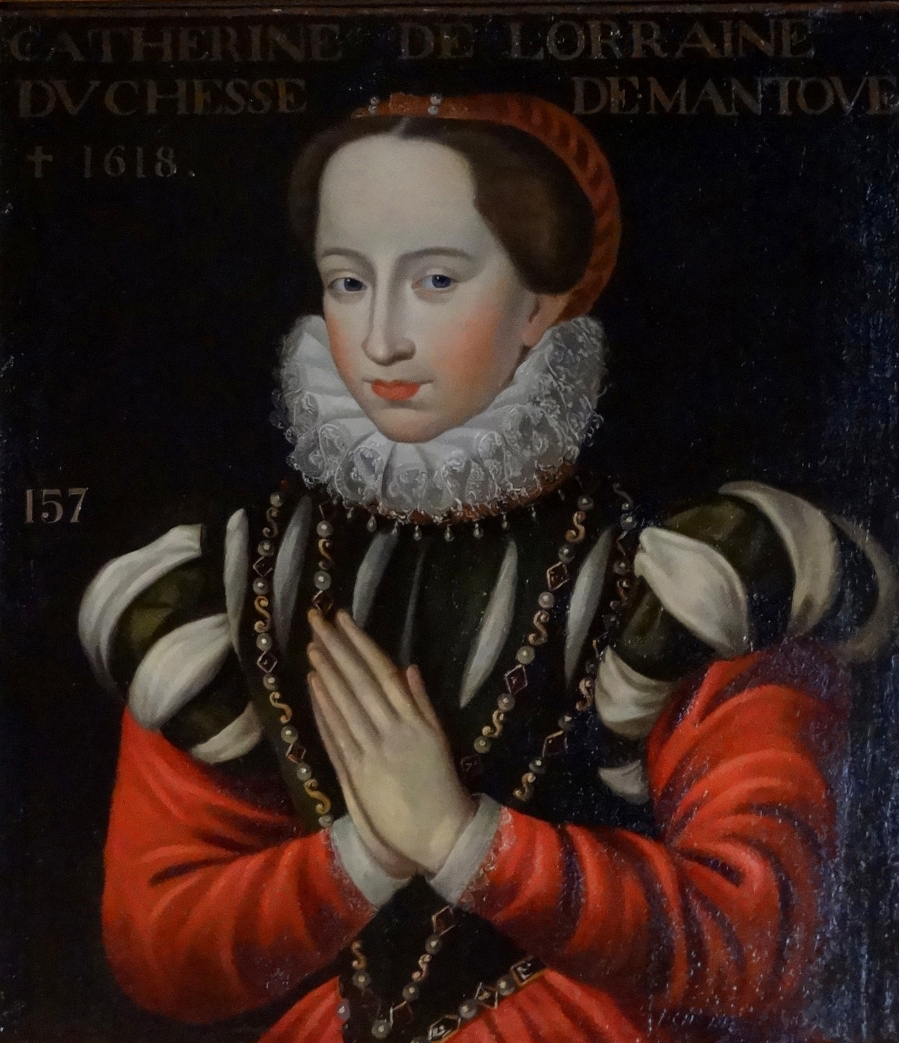 Catherine’s highly visible dress consists of red sleeves and over-skirt combined with a black and white bodice. Her ruff probably rests on a supportasse. This is a wonderful example of French sleeves.