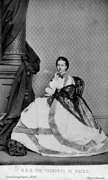 Keywords: 1863, Queen Alexandra, Alexandra of Denmark, Alexandra af Danmark, Alexandra Carolina Marie Charlotte Louise Julia, prinsesse af Danmark, Princess of Wales, Queen of the United Kingdom, Glucksberg family, Welf family, Wettin family, Princess, Queen, straight coiffure, chignon, earrings, high neckline, chemise, collar, bow tie, long full sleeves, crinoline, over-skirt, earrings, lace wrap
