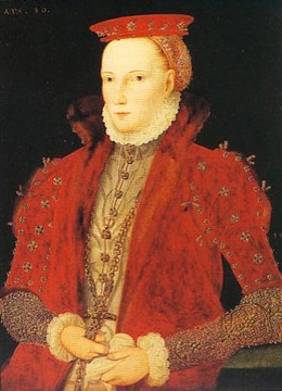 Elizabeth wears abundant gilt and glitter on what appears to be a house coat and house dress as well as a cap and escoffion to cover her head in this 1563 portrait.