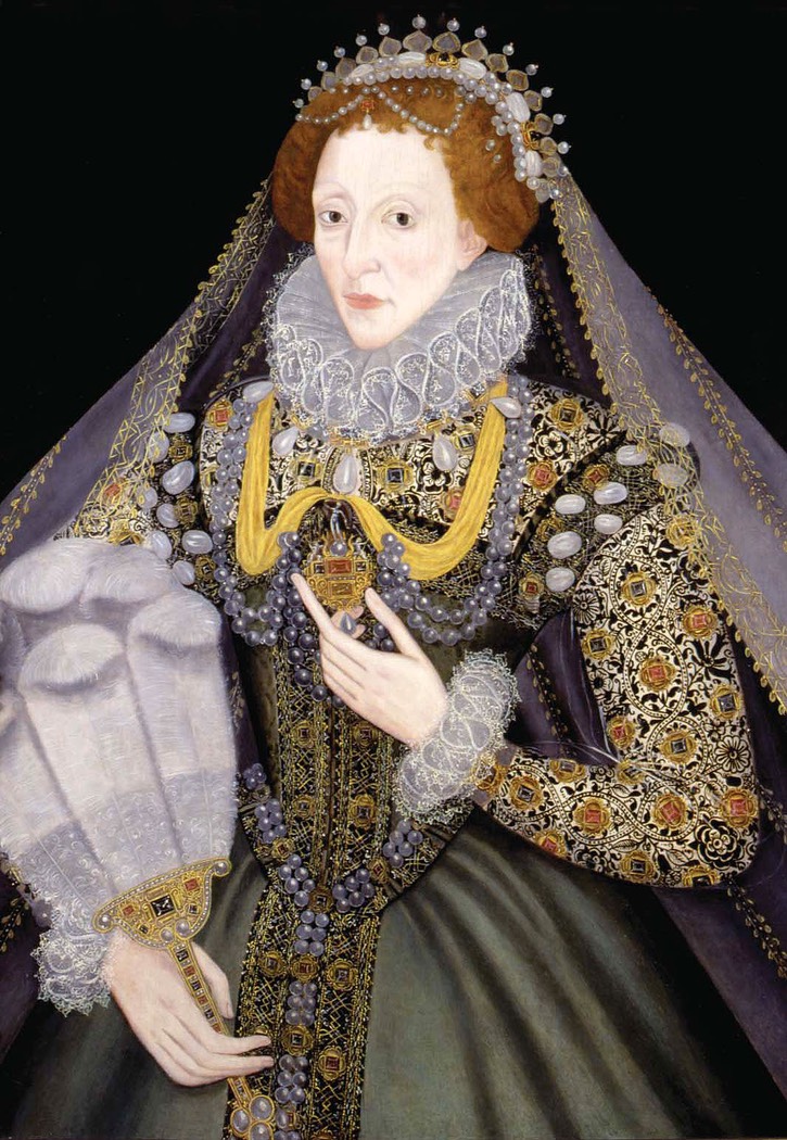 Elizabeth, or the artists portraying her, could exercise some restraint with the glitz by wearing un-patterned skirts and bodices as seen here.