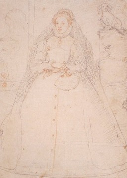 A well-known portrait of Queen Elizabeth wearing a bouffant farthingale done in red chalk by Federico Zuccaro. The Wikipedia article for Federico Zuccaro is here.