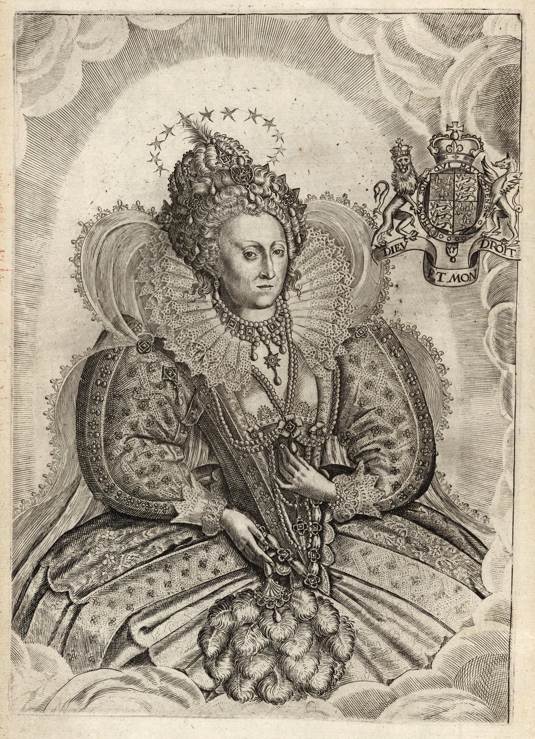 Keywords: Hilliard, Queen Elizabeth, Tudor family, Queen, English, curly coiffure, crown, jeweled headdress, lace, square neckline, neckline ruff, lace, outer ruff, veil, long puffed sleeves, lace back-flared cuffs, ruffles, stomacher, revers, deep vee waistline, wheel farthingale, over-skirt, necklace, draped necklace, jeweled sleeves, bracelets, jeweled fan