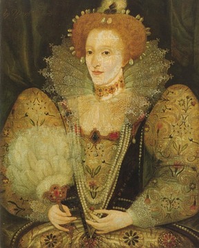 This portrait also shows Queen Elizabeth of England wearing a dress with gargantuan puffed sleeves. Her ruff is of great interest - it appears to be free-standing, much as it would be in many portraits of the early 1600s. Also, there is enough room above the collar to allow her to wear a choker or "dog collar" necklace, something not seen in the many other portraits of her.