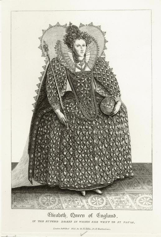 This shows the full wheel farthingale dress with lace-fringed outer ruff, both crown and jeweled headdress, ruff, sleeves emerging from lined capelets, robe, necklaces, and fully jeweled gown covered with diamond patterned cloth tufts surrounding jewels. Norris wrote about this gown (from the original on which this print is based) in Tudor Costume and Fashion, pp. 604-606 (1997 Dover re-issue, "It... is said to represent the dress in which she went in state to St. Paul's... It is the earliest portrait of the Queen showing her dressed in full band or ruff, long stomacher, veil, and wheel-farthingale... The bodice, long hanging sleeves, and over-skirt are composed of white satin brocaded or embroidered with a gold scroll design. The sleeves, stomacher, and under-skirt with cart-wheel arrangement on top are of cloth of gold, covered with diagonal puffings of fine white silk: alternate intersections are decorated with groups of five pearls each, and rubies set in gold mounts, and a large pearl poses in the center of each lozenge of the gold foundation.