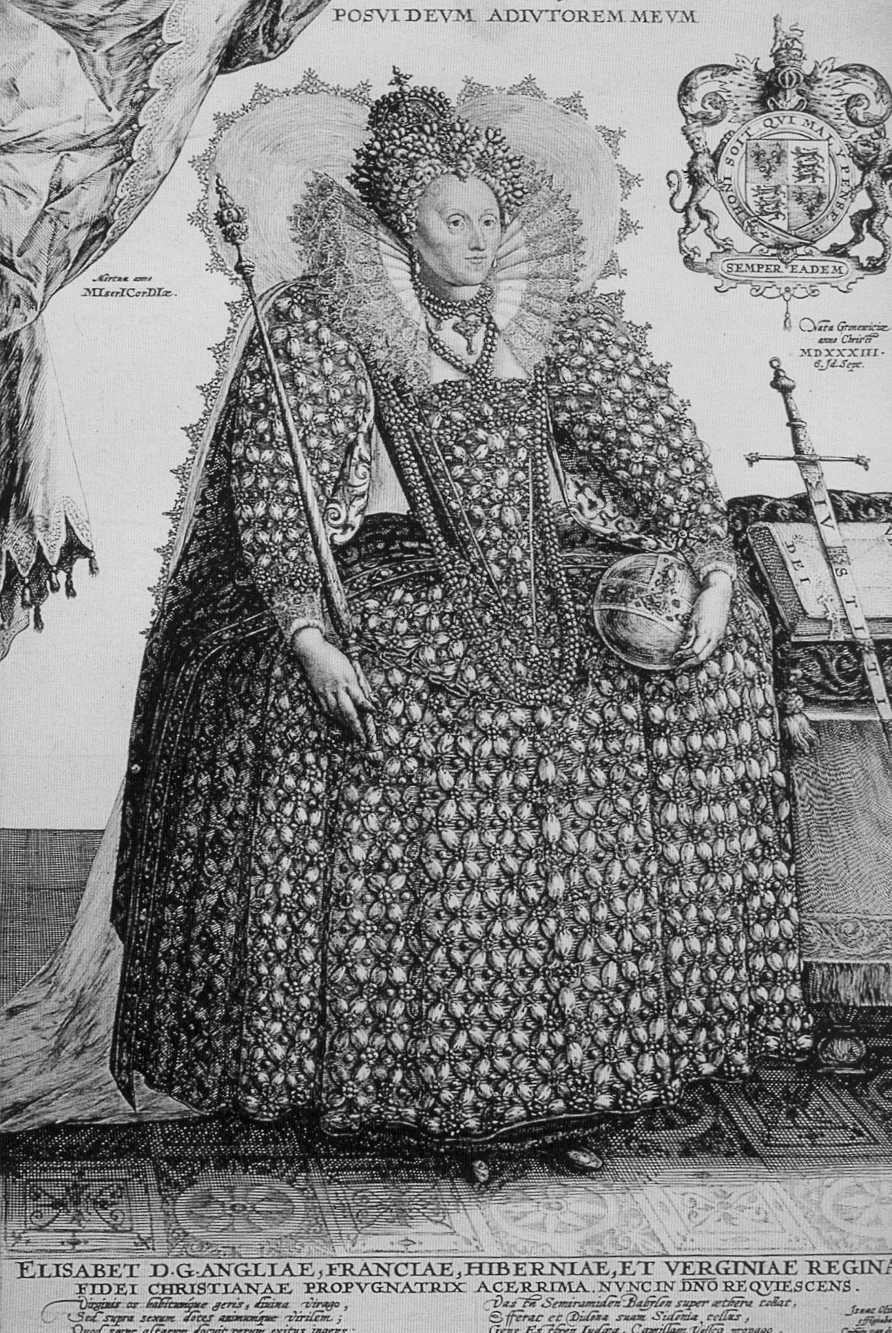 Keywords: Tudor family, Queen Elizabeth, English, Queen, curly coiffure, coronet, jeweled headdress, framing headdress, bodice, partlet, lace neckline ruff, square neckline, outer ruff, veil, long hanging sleeves, lining, long puffed false sleeves, lace back-flared cuffs, stomacher, puffed cloth ornaments, girdle, deep vee waistline, wheel farthingale, maxi length skirt, under-skirt, choker necklace, draped necklace, jeweled neckline, jeweled bodice ornament, jeweled sleeves, jeweled skirt, shoes, regalia, geometric pattern in dress
