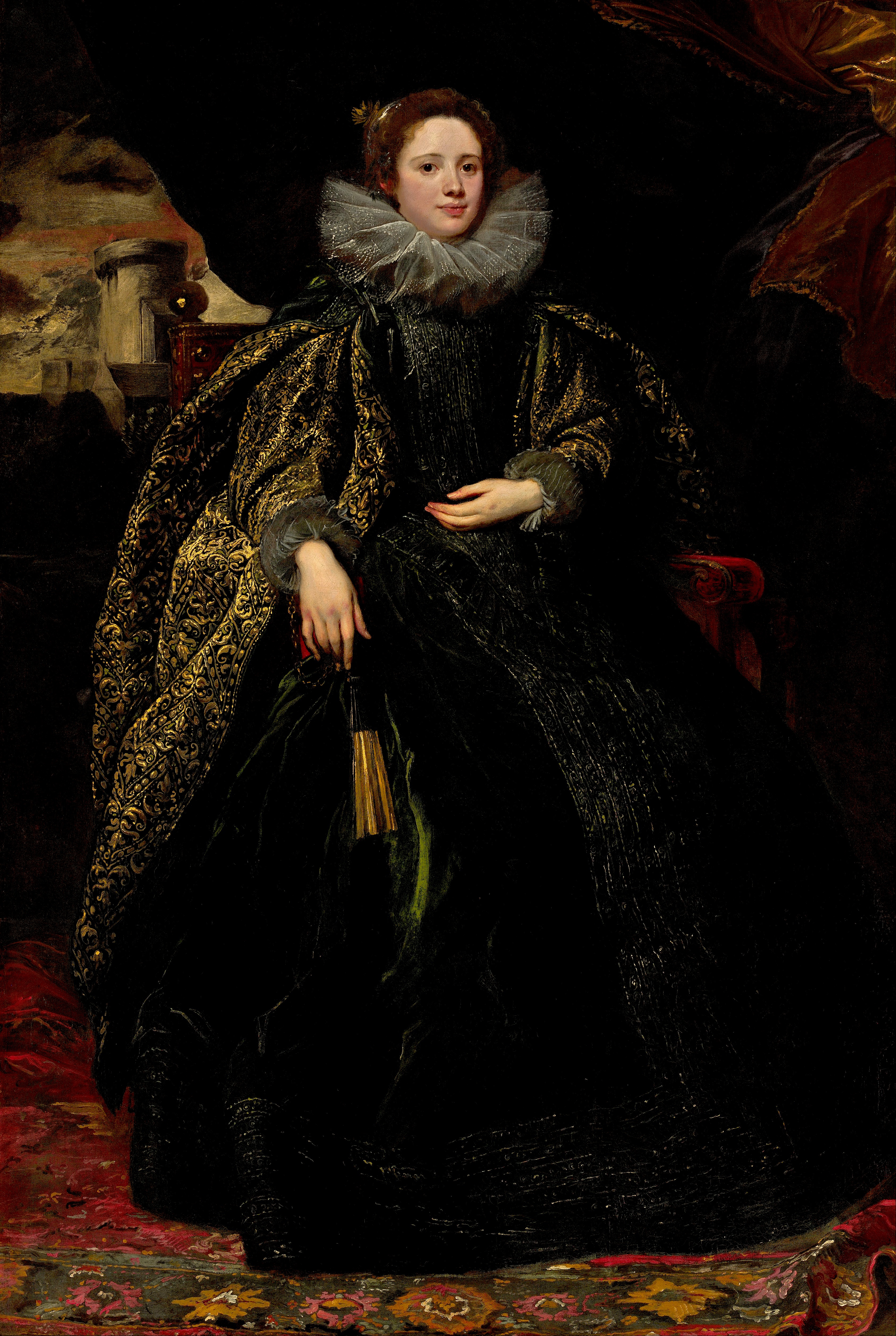 This higher quality image shows the Marchesa Balbi's dress has very long hanging brocade and matching full (instead of tight) false sleeves over a dress of dark green material decorated with parallel bands of gilt trim down the center front and hem. Her ruff is trimmed with patterned dots rather than conventional lace.