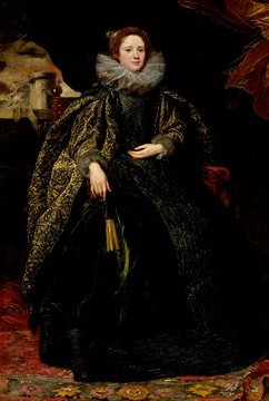 Keywords: 1625, van Dyck, Marquise, Balbi family, Italian, high enclosing neckline, neckline ruff, headdress, hanging sleeves, false sleeves, cuffs, tabbed bodice, basque bodice, full skirt, fan