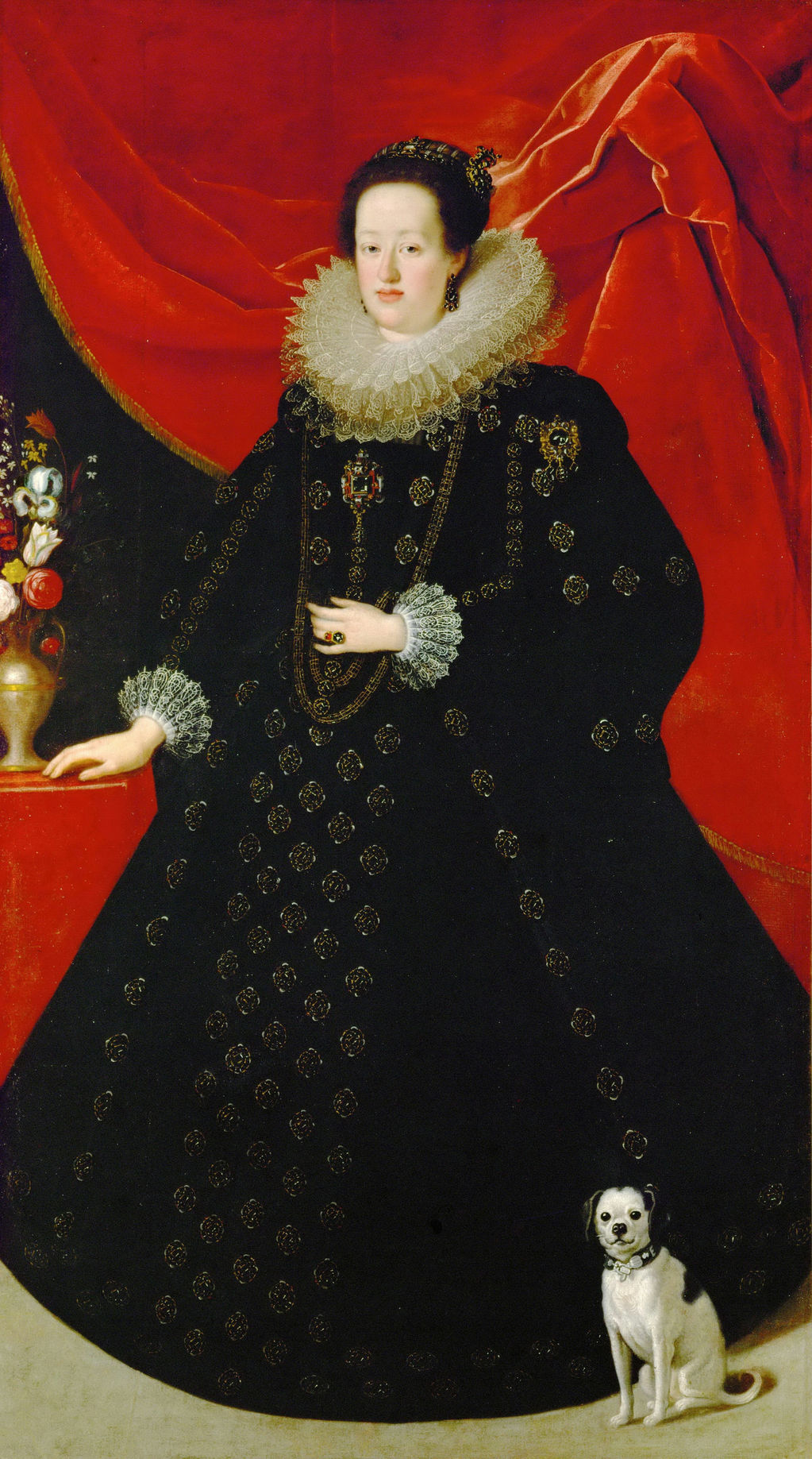 Keywords: 1623, Sustermans, Eleanor Gonzaga (1630-1686), Gonzaga family, Habsburg family, Princess, Empress, frizzy coiffure, jeweled headdress, high enclosing neckline, neck ruff, lace, tabbed sleeves, hanging sleeves, back flared cuffs, girdle, basque waistline, farthingale, saya, necklace, earrings, pendant, brooch
